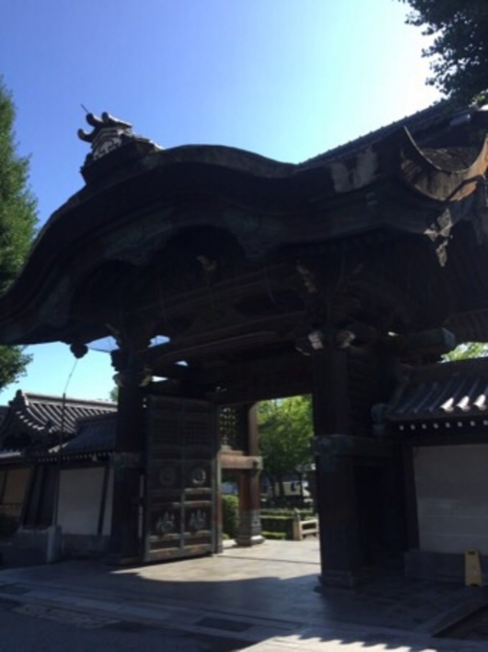 東本願寺の表門で、切妻造、檜皮葺きの四脚門です。