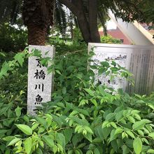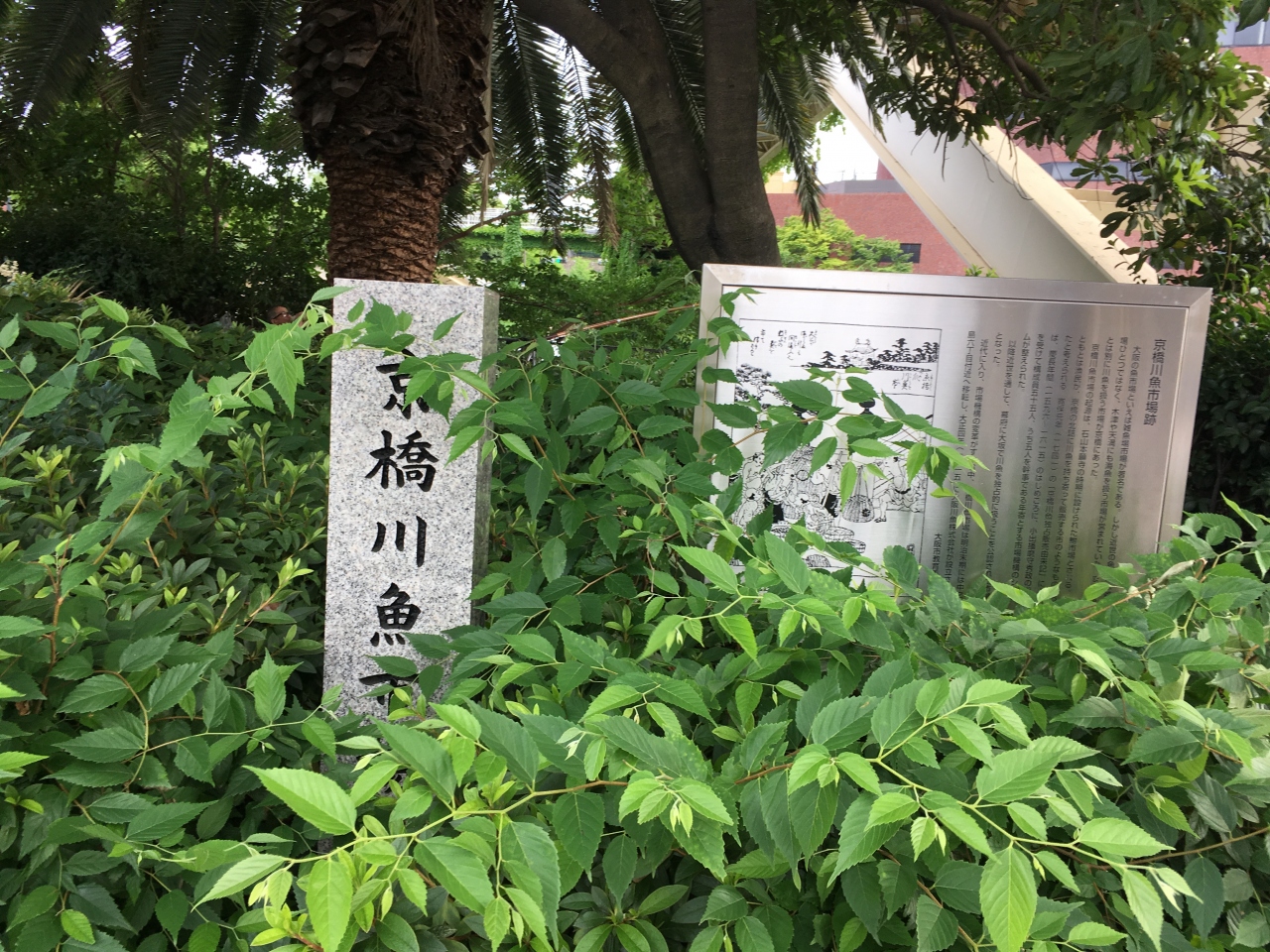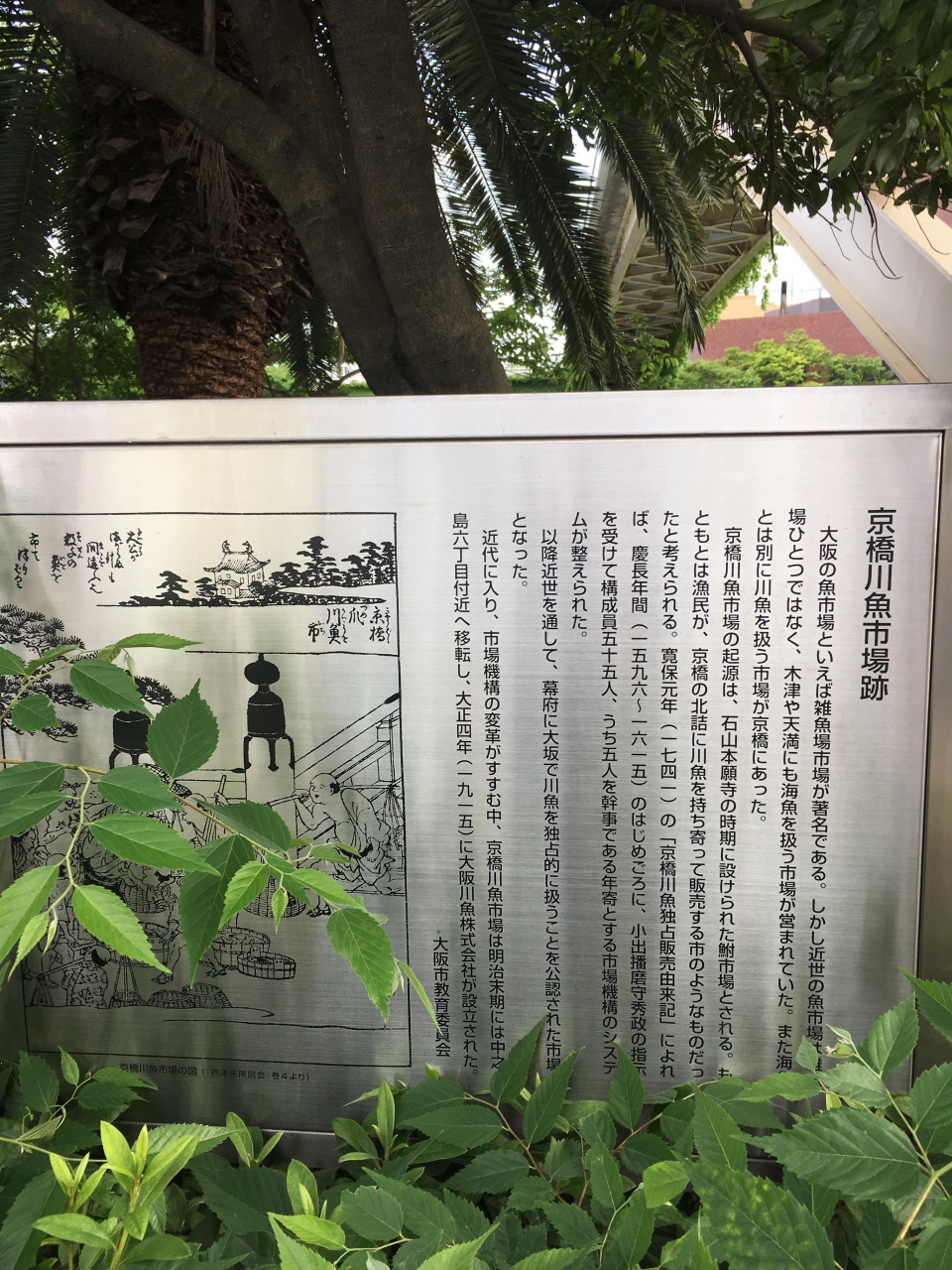 旧淀川に当たる、大川、寝屋川などが集まるこの場所に明治末まで存在した川魚専用魚市場だそうです。しっかりした解説文付き解説文なのですが、草ぼうぼうで写真のような状態で油断すると見逃します。寝屋川橋の東詰あたりにあります。