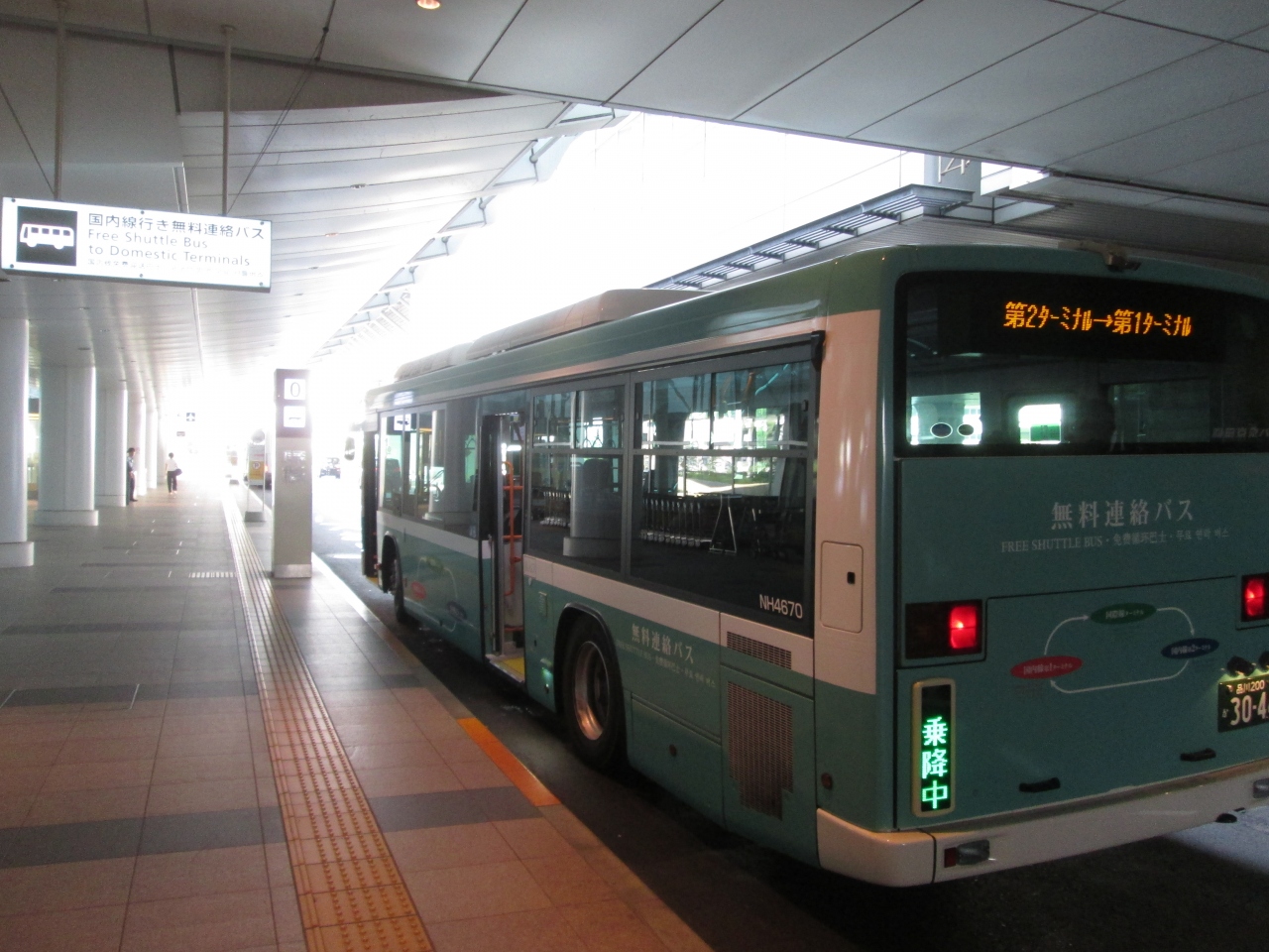 羽田空港ターミナル間無料連絡バスのバス停に到着すると、すでにバスは停車していました。旅行用のかばんを持ちながら乗る意志を示すと、ミラー越しに運転手さんは注意しており、臨機応変に対応してくれて、出発するのを少し待ってくれました。