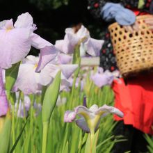 この時期限定で、花摘み娘がショウブ園のお世話をしています。