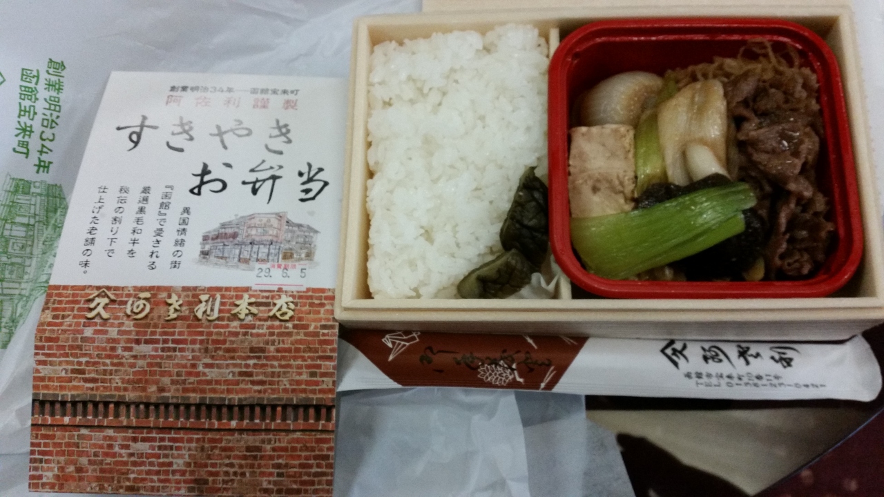 羽田発の函館空港を利用し、ガイドブックに載っていたのですき焼き弁当を予約し「ポルックス」で購入しました。「阿さ利」の「すき焼き弁当」1240円です。温めるのをお勧めします。細い細い白滝と、お肉、ネギが甘いお醤油味で美味しかったです。