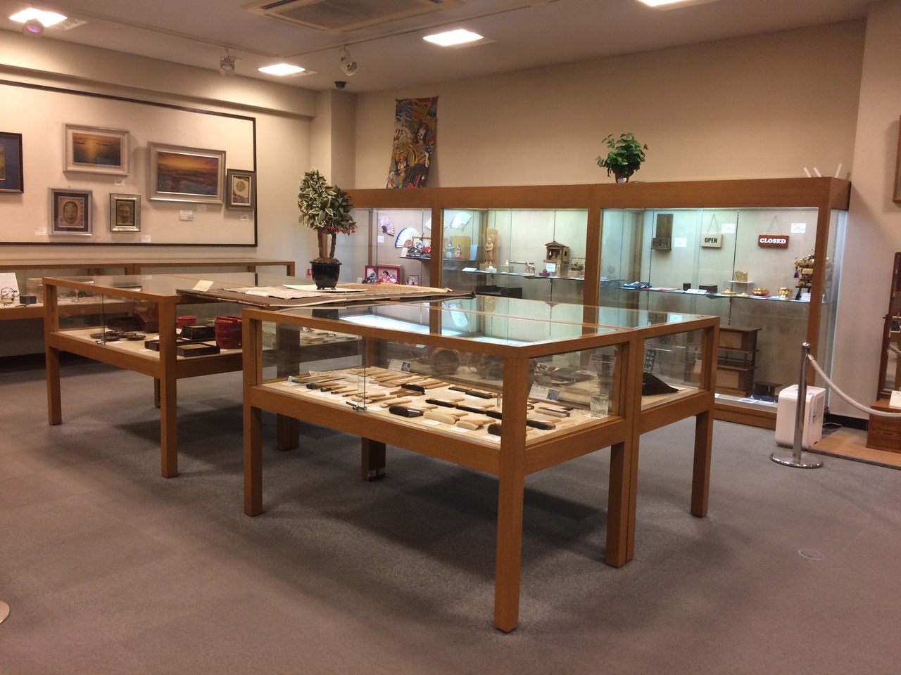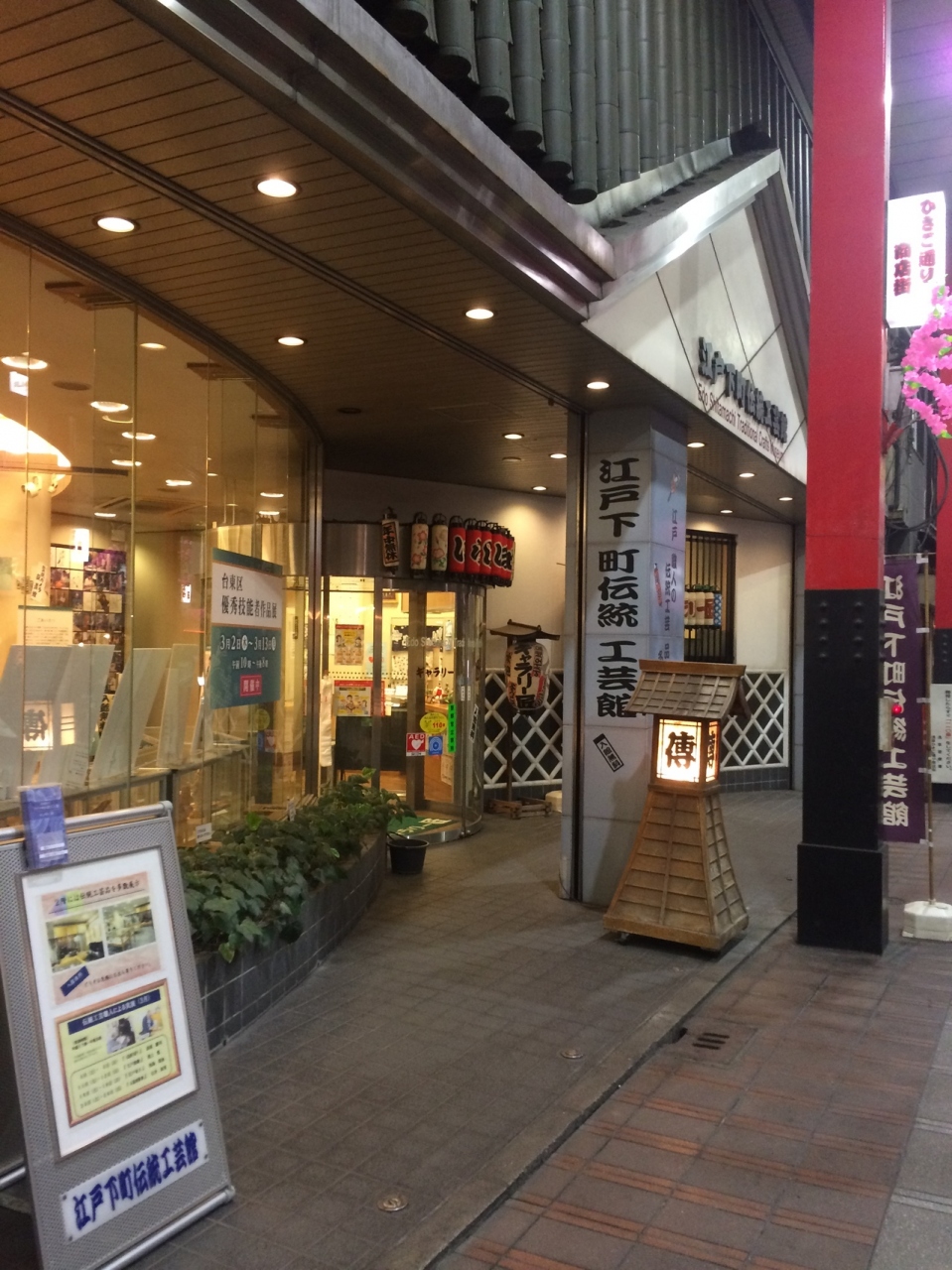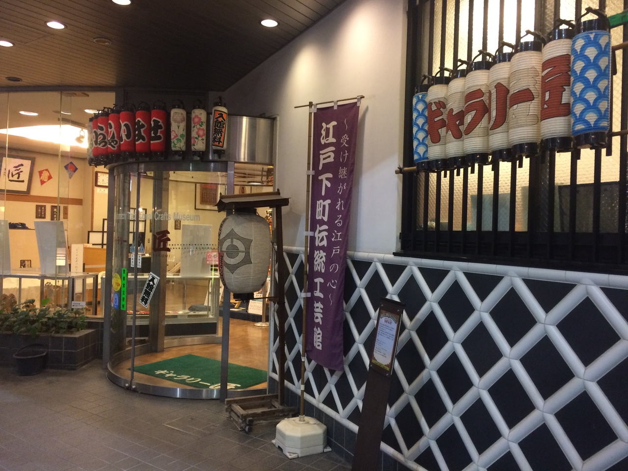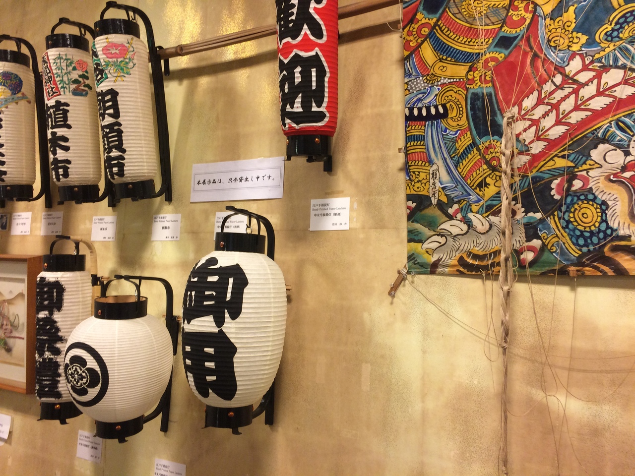 外観からして江戸の下町を感じされる雰囲気でした。綺麗で新しい館内で、御用提灯やいくつかの提灯が飾ってありました。凧揚げの凧も展示されて、いかにも江戸っぽい絵柄でした。筆の展示もあり館内は美術館のような雰囲気でした。