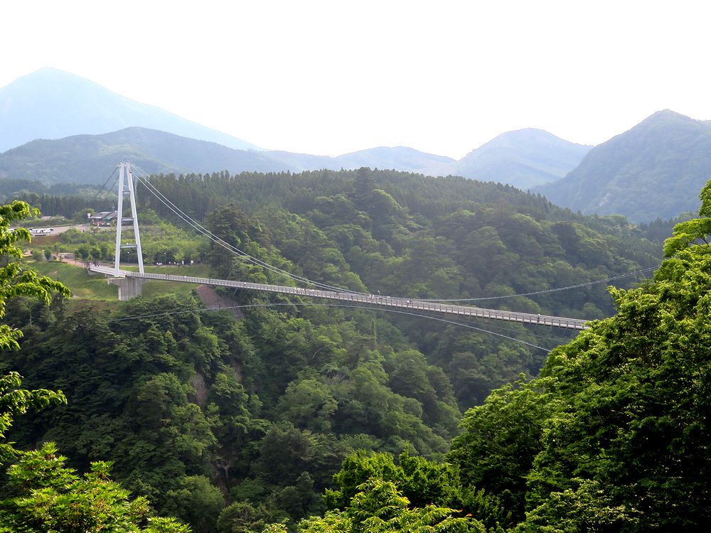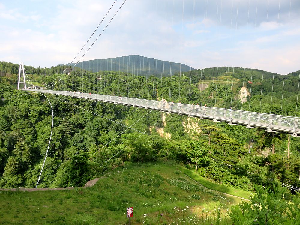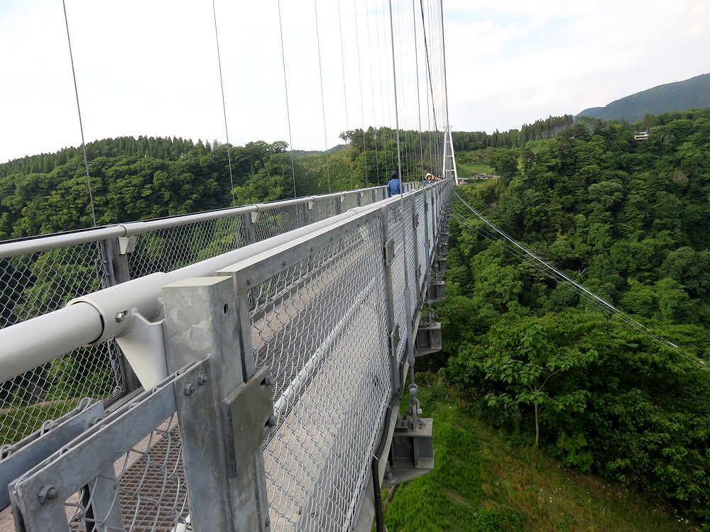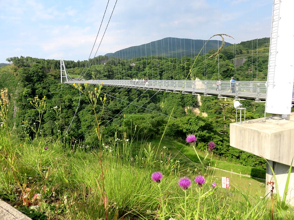 大分県玖珠郡九重町の渓谷にかかるつり橋は高さが日本一。阿蘇に向かうやまなみ街道から少し狭い道を下ったところにある。私達は夕方4時近くに着いて、反対側の展望台まで往復したが、4時半で入場停止しましたというアナウンスが流れたので、急いで橋を渡り、駐車場のあるほうへ戻った。入場料は500円。滝が2つ流れ落ち、紅葉の時に訪れたいところだ。なお、駐車場に向かう手前に何件か建物があり、シャッターがおりて無人となった建物の二階に、突き出たような展望テラスがある。このテラスの前には駅の改札口のようなものがあり、100円を入れればテラスに出ることができ、つり橋を高いところから遠望できる撮影スポットになっている。