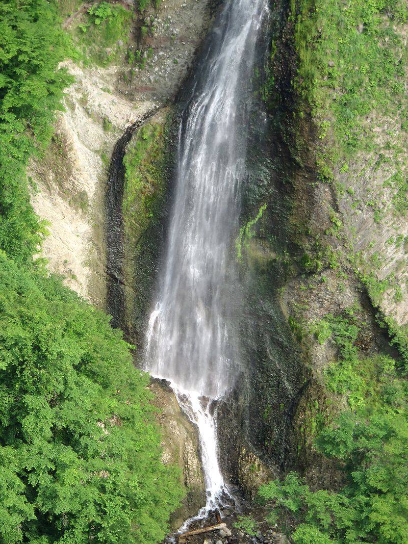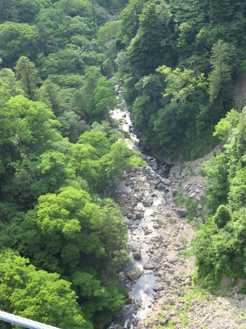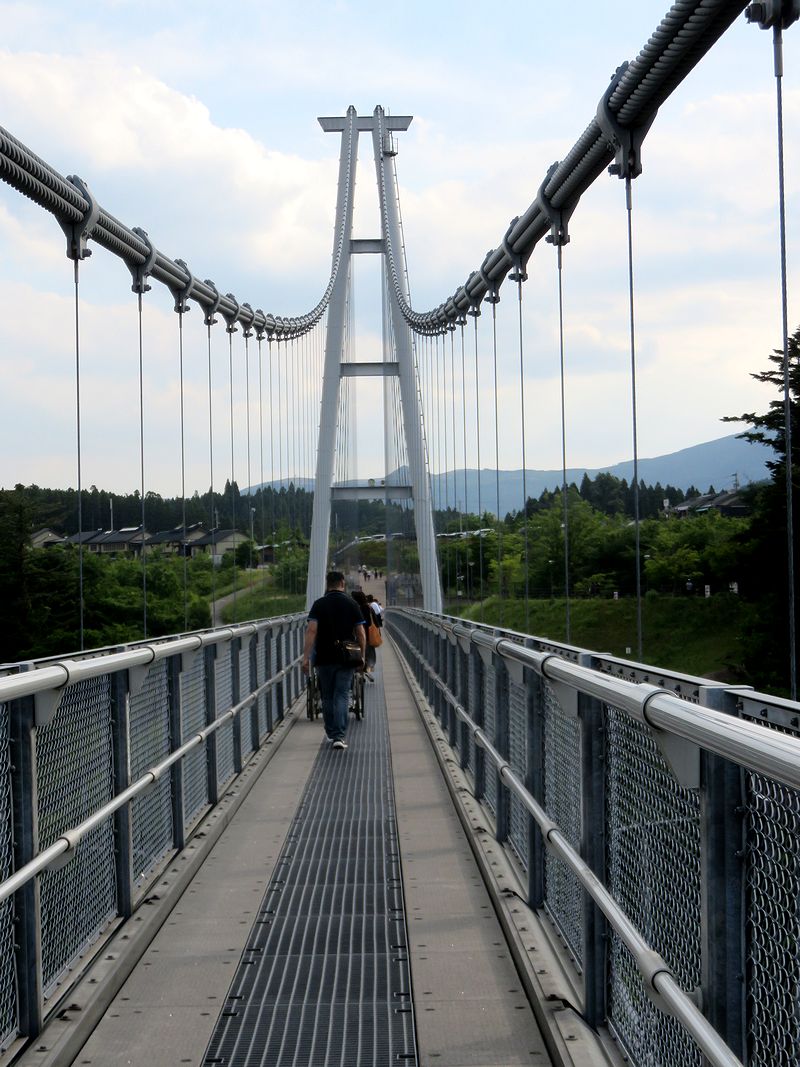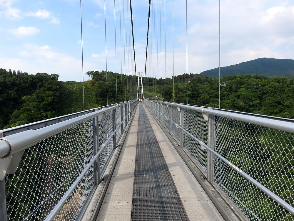 大分県玖珠郡九重町の渓谷にかかるつり橋は高さが日本一。阿蘇に向かうやまなみ街道から少し狭い道を下ったところにある。私達は夕方4時近くに着いて、反対側の展望台まで往復したが、4時半で入場停止しましたというアナウンスが流れたので、急いで橋を渡り、駐車場のあるほうへ戻った。入場料は500円。滝が2つ流れ落ち、紅葉の時に訪れたいところだ。なお、駐車場に向かう手前に何件か建物があり、シャッターがおりて無人となった建物の二階に、突き出たような展望テラスがある。このテラスの前には駅の改札口のようなものがあり、100円を入れればテラスに出ることができ、つり橋を高いところから遠望できる撮影スポットになっている。