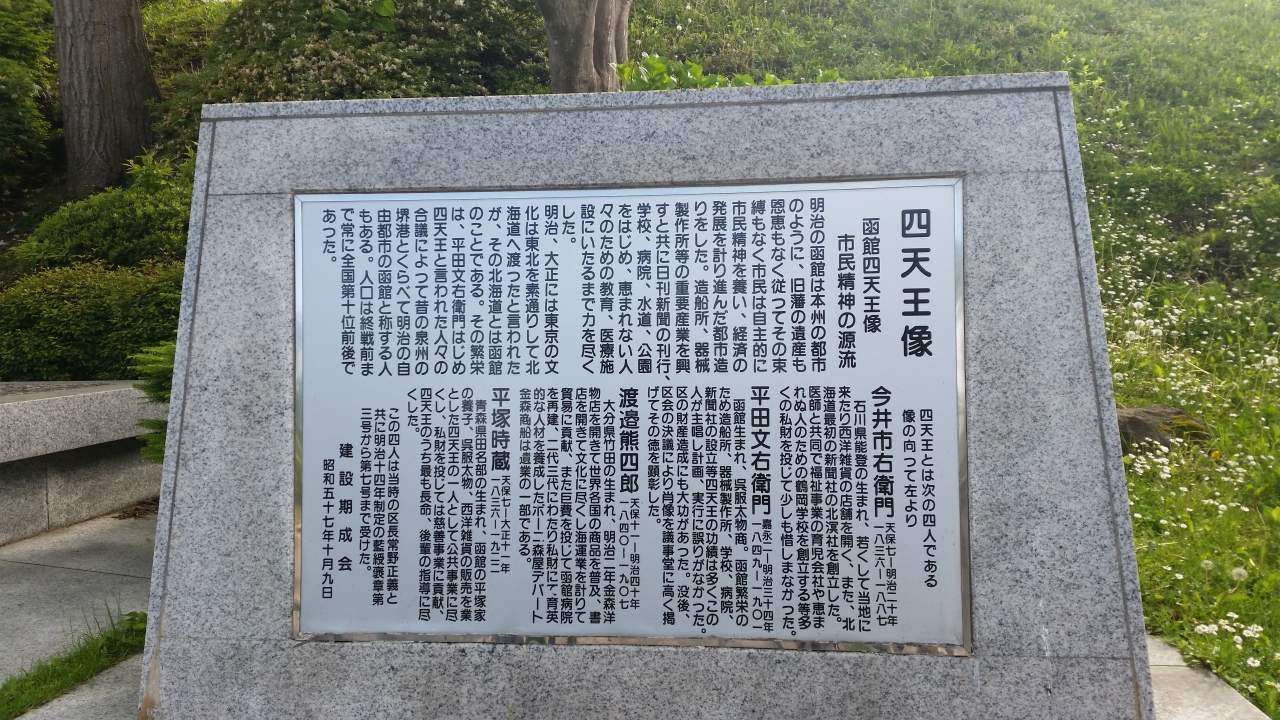 友達3人で訪問しました。誰だろうと近寄って見ました。向かって左から順に、今井市右衛門、平田文右衛門、渡邉熊四郎、平塚時蔵だそうです。この四天王は函館戦争の終結後、新しい函館の街を開拓した四天王だそうです。