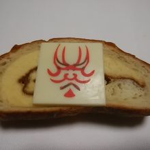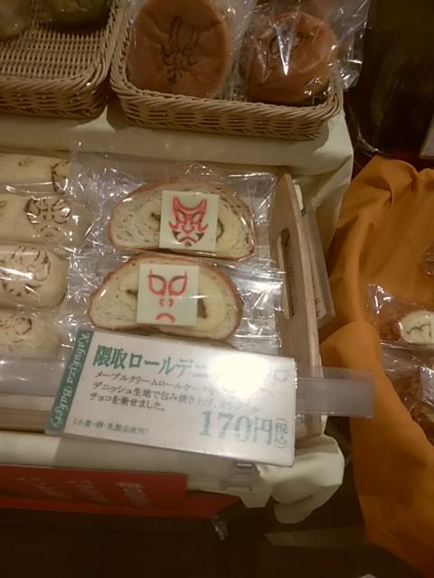 歌舞伎座の地下2階は、歌舞伎に関するいろんなお土産ものが売られていて見てまわるだけでも楽しいです。こちらのはなみちというお土産ものやさんの店頭に並んだパンの中から、くまとりのホワイトチョコがのった「隈取ロールデニッシュ」170円(税込)を購入しました。