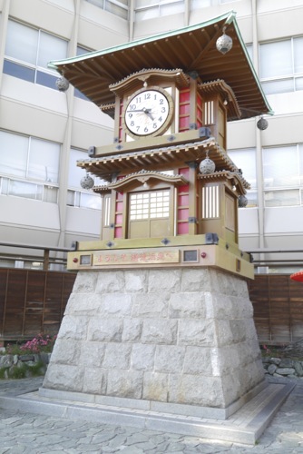 道後温泉の駅前、アーケードの入り口手前すぐにある時計。けっこう地味なので、意外と目立たない。時計の根元横すぐには足湯があるので、毎時0分のカラクリが動き出す前に来てしまっても、足湯に浸かって待てば効率よく観光できます。笑。時間になるとたくさんの人がやってきます。