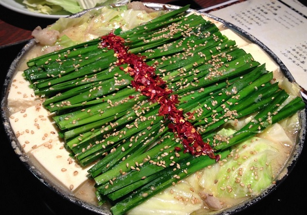 もちろん注文はもつ鍋で、鍋の一面にはニラが、そして唐辛子、色合いがいいですね。
