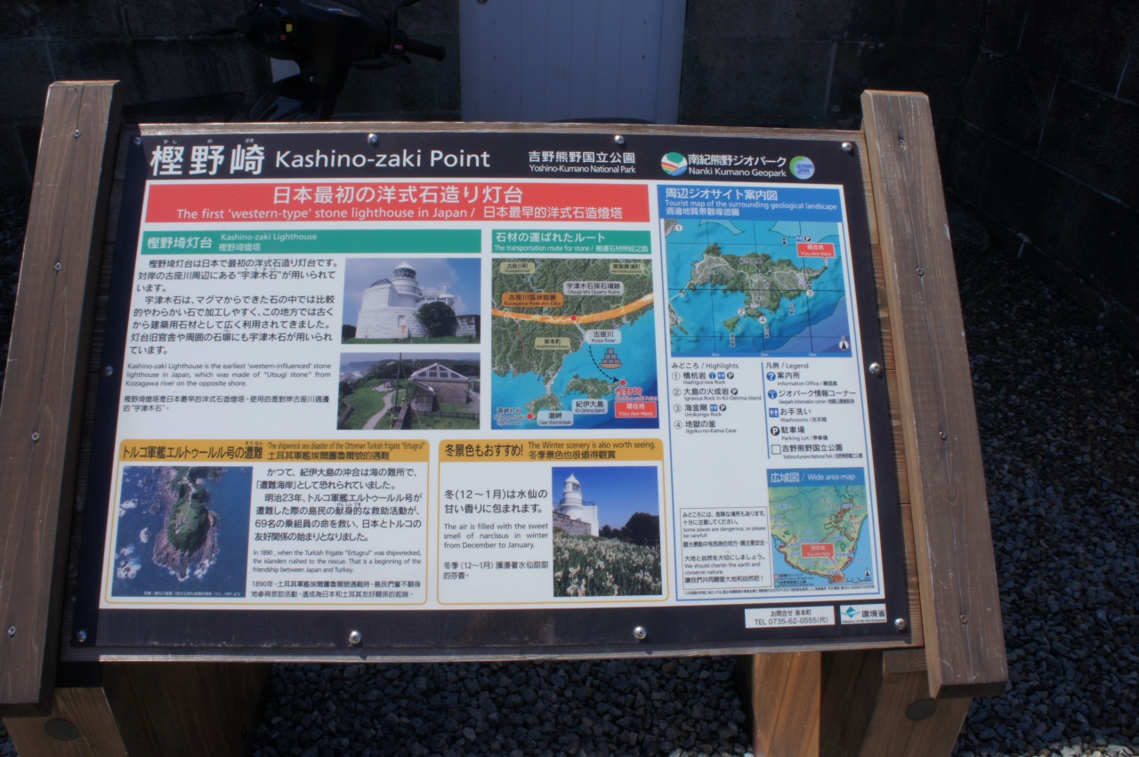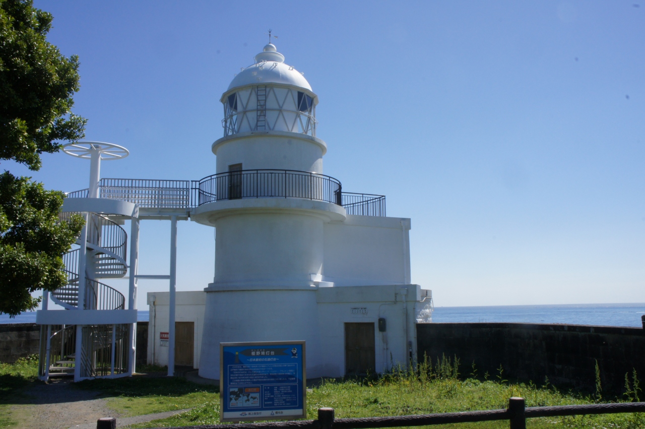 紀伊半島の観光で潮岬から紀伊大島に渡り、トルコ記念館の見学後にこの岬に立つ灯台を訪れました。全体的には小ぶりなサイズで、灯台の左に螺旋階段が付いています。その前に案内板がありこの灯台の歴史について詳しく書かれています。灯台の手前にある旧灯台官舎の横にもこの灯台についてもっと平易な内容で説明されています。日本で初めて石で建てられた灯台で、その石は対岸の古座川で採れる石を運んで造られたと案内板に書かれていました。トルコ記念館や鬼金剛の観光の一つにぜひ入れたい名所です。