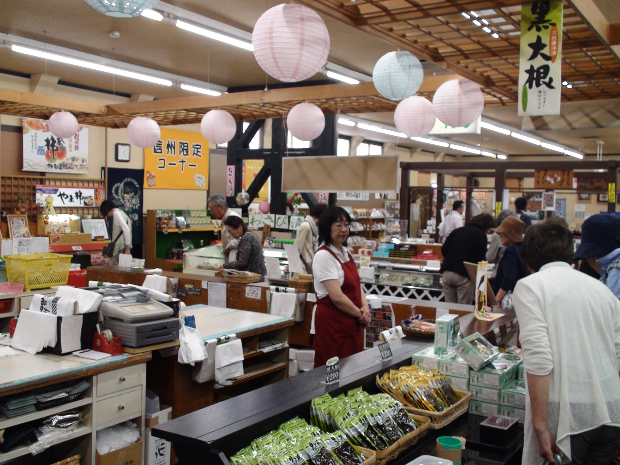 飯田インターより約10分足らずで着く。店内は広くあらゆる漬物の試食が出来、自分の気に入ったものが選べる。ここのお勧めはなんと言っても、野沢菜の漬物である。値段も手ごろできれいな箱に入って700円であった。その他長いもの漬物が珍しく3種類のつけ方があり1000円で購入できた。