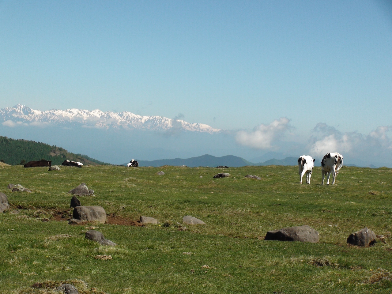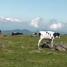 王ヶ頭ホテルから山本小屋までが朝のトレッキングコースとなっており、歩くことにした。放牧用の柵がしてありそれに沿って約50分ほどの工程で平坦な道が続く。途中牛やポニーの放牧が見られ目を楽しませてくれる。少しではあるが道筋には高山植物も見られ心地よい風に吹かれ2000m級の山の風景を堪能した。