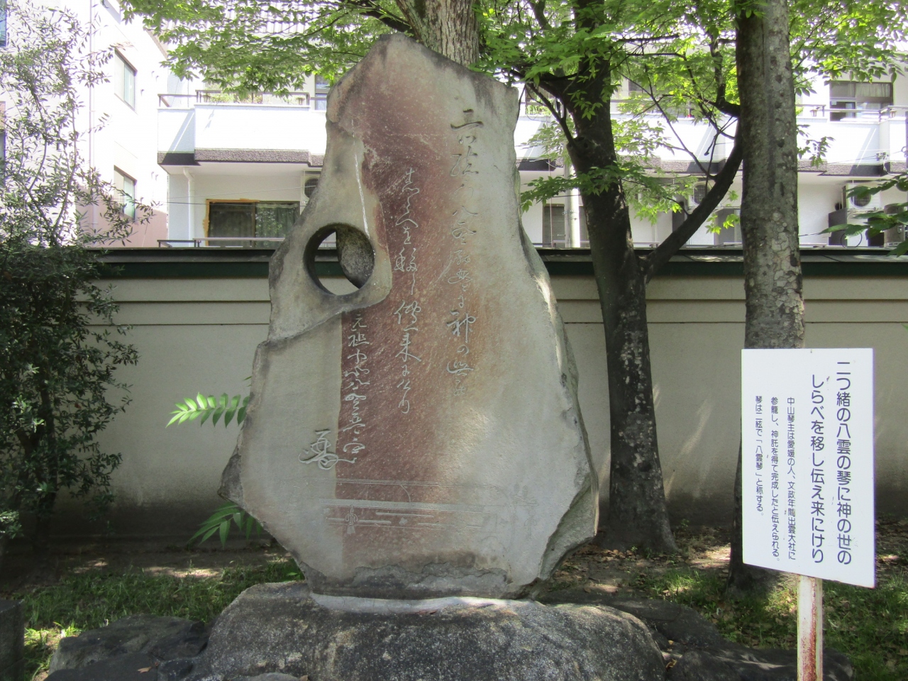歌碑には見ずらいですが、「二つ緒の八雲の琴に神の世の調べを移し伝え来にけり」ときざまれています。