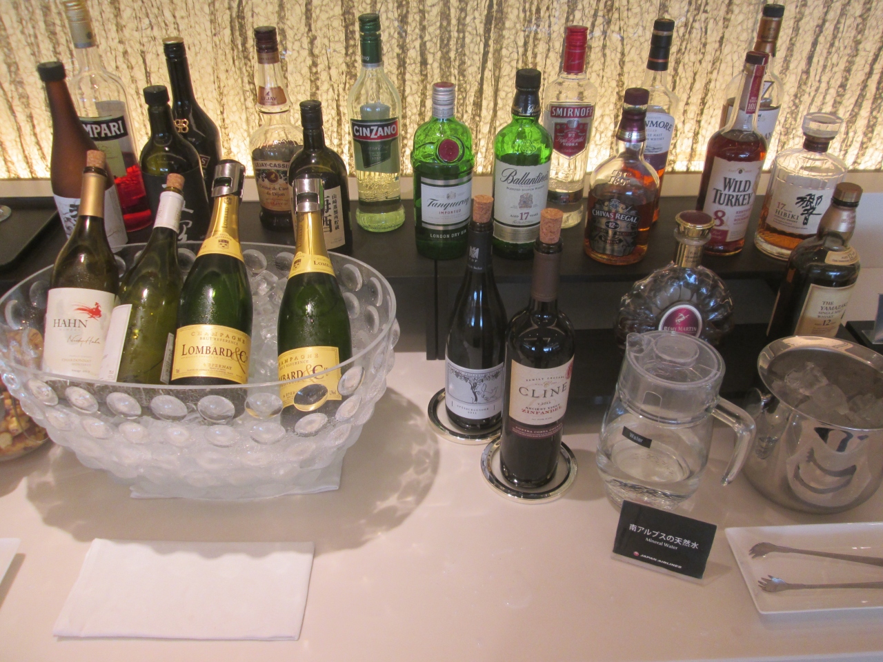 JALファーストクラスラウンジにはサクララウンジにないアルコールが置いてあり、明らかに種類が増えていました。厳選された日本の銘酒を見かけ、氷で冷やされたシャンパン「ローラン・ペリエ」がありました。専用のリーデルのグラスがあり本格的なバーにいるような感覚でした。