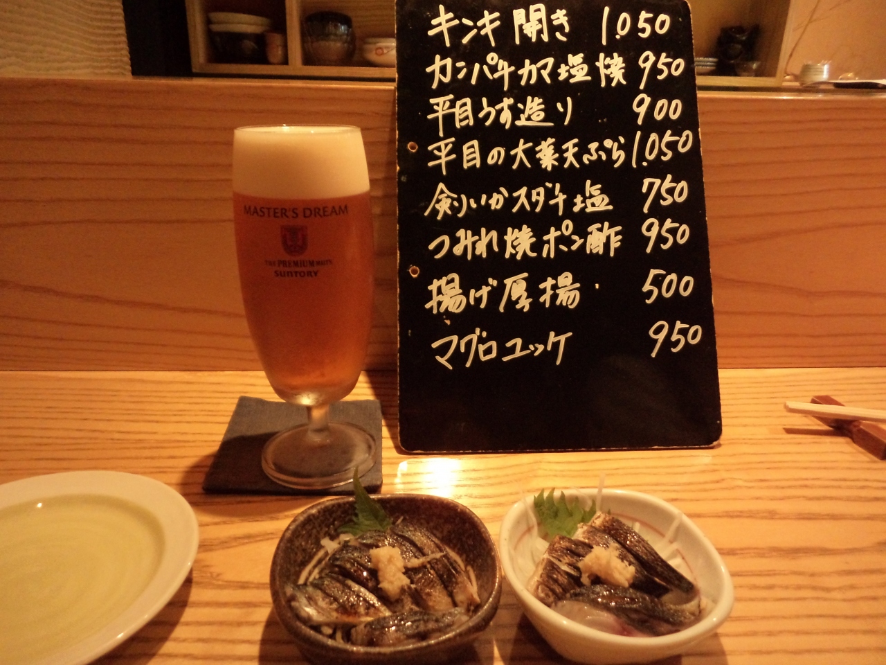 まずマスターズ ドリームの生ビールから頂き、焼酎やウィスキーも数種取り揃えているので~好みの飲み物が選べました。