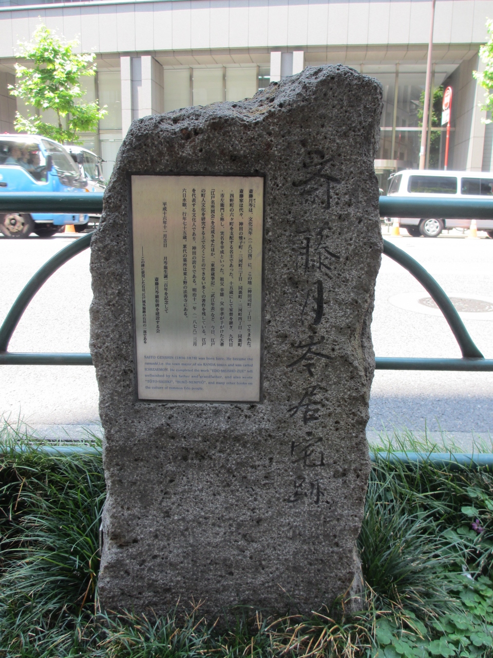 地下鉄淡路町駅近く、外堀通り沿いの司町2丁目交差点から北へ100mほど行ったところの歩道にある植え込みに立っています。高さ1mほどの石に月岑の功績が書かれています。神田生まれの江戸を代表する文化人として、江戸名所図会や東都歳事記などの作品を残した人物です。江戸の町人文化を研究する際に欠かすことができない書物だそうです。亡くなって140年以上たった現代にも影響を及ぼしている素晴らしい人物だと思います。数か月前に訪れた上野の法善寺で、斎藤家の墓を探したことがありましたが見つかりませんでした。今回居宅跡を探すことができたので、再度法善寺に行ってみようと思います。