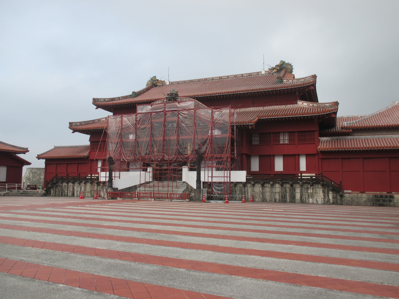 首里城のメインの建物で、有料エリア内にあります。現在正殿正面側漆の塗り直し作業をしている関係で、シートに覆われてました。残念。建物内部にも入れます。