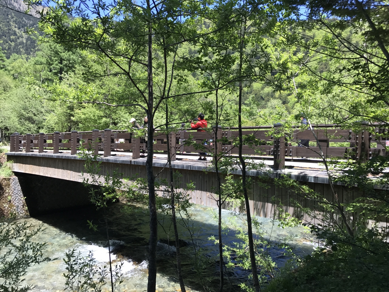 大正池から河童橋へ向かう途中にある木製の立派な橋です。大正池から歩いて40分ほどでしょうか。橋の下には水がきれいな梓川が流れて風光明美な景色が楽しめました。近くには上高地温泉ホテルや帝国ホテルもあって、宿泊施設が建ち並んでいます。