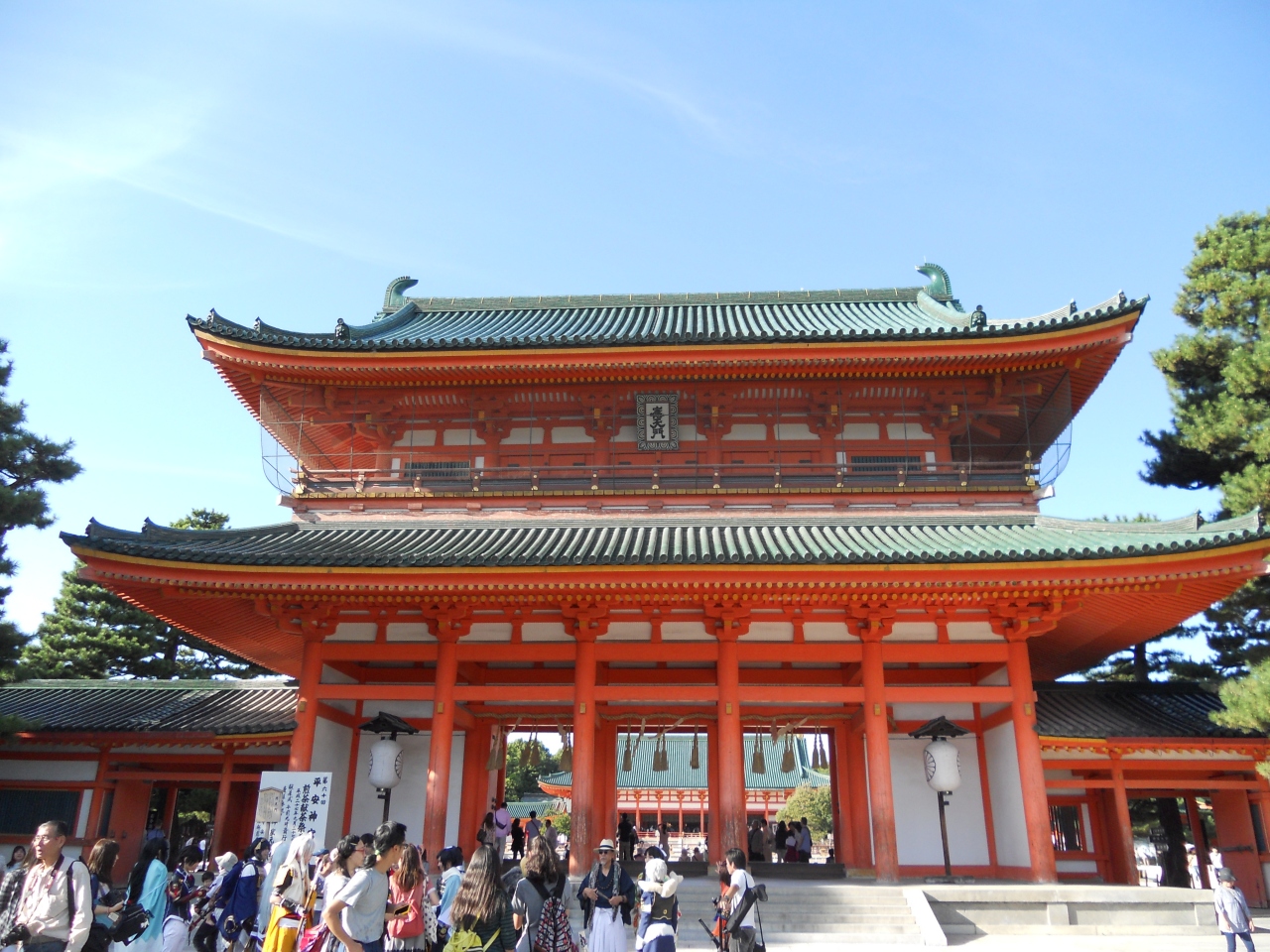 平安遷都1100年を記念して創建された「平安神宮」の正門である「応天門」は、かつての「平安京の応天門」の8分の5の大きさで再建されたものですが、それでも高さがあって、鮮やかな朱塗りに緑の屋根瓦とのコントラストで、その美しさは圧巻でした☆
