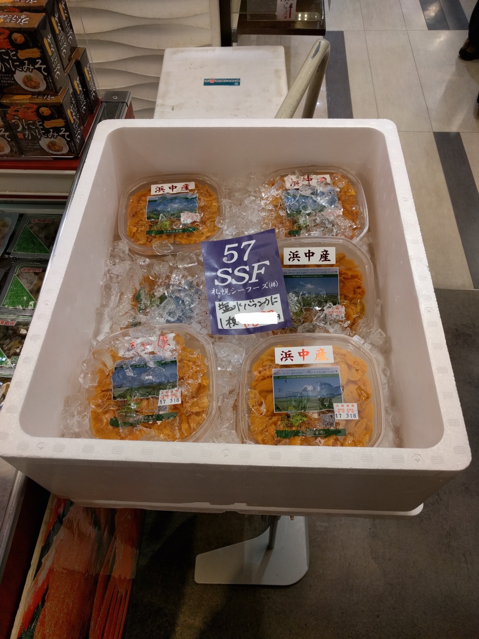 「札幌シーフーズ」に行った。立ち食い寿司屋が賑わってる店だ。前から行きたかったが食いたいときに満席で、腹一杯のときに見たら空いてる。浜中産の塩水バフンウニが売っており、追加で買った。店の人にうまそうなのを選んでもらい、いい買いもんができた。