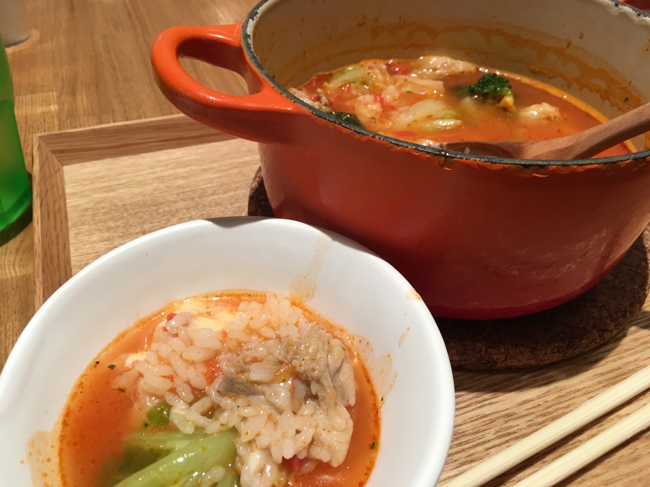 待つことしばし、鍋が運ばれてきた。フツフツとトマトスープが煮立った中に野菜と鶏肉が混じり、更に下にはご飯が隠れているので、希望通りのおかゆだ。スープの味も濃すぎず薄すぎず良い感じ。