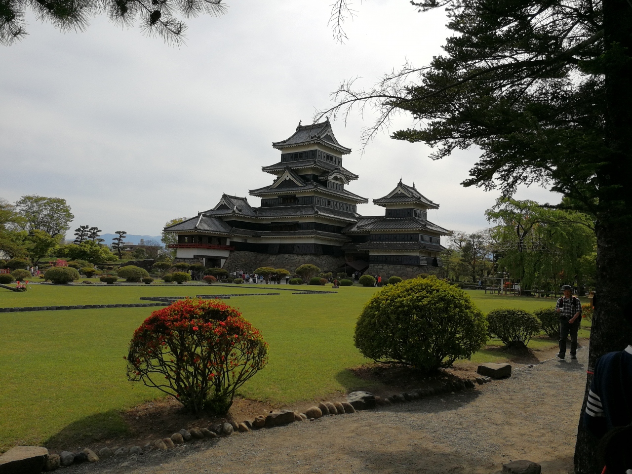 5月初旬のピークシーズンの日、松本城に入る前のため、長い時間で待ちながら、木の下で外の緑の芝生を見って、心に穏やかになりました。椅子もあるから休憩して、快適にします。大面積の緑の木はだけでなく、夏の初めの赤い植物も植えた。