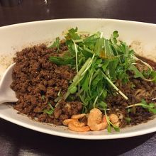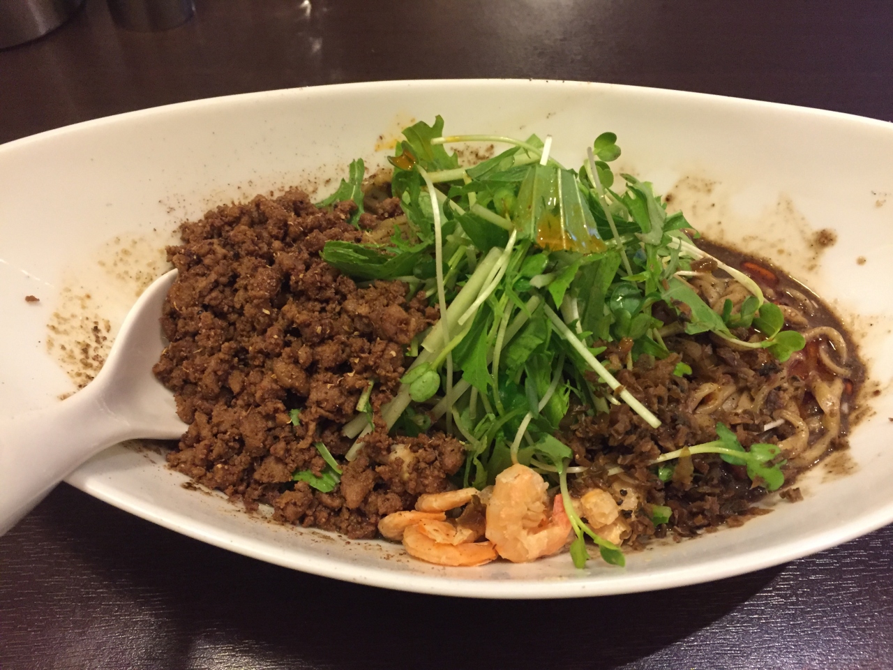 (汁なし)担々麺は担々麺黒ごまと白ごまがあるので、黒ごまをチョイス。いかにも中毒性ありそうなビジュアル。