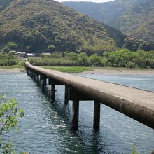 四万十川に架かる沈下橋の一つです。四万十川に架かる沈下橋で3番目の長さです。一直線に伸びた橋の途中にはすれ違い用に、幅員が広くなっている場所がありますが、こんな所では決してすれ違いたくはないと思いました。