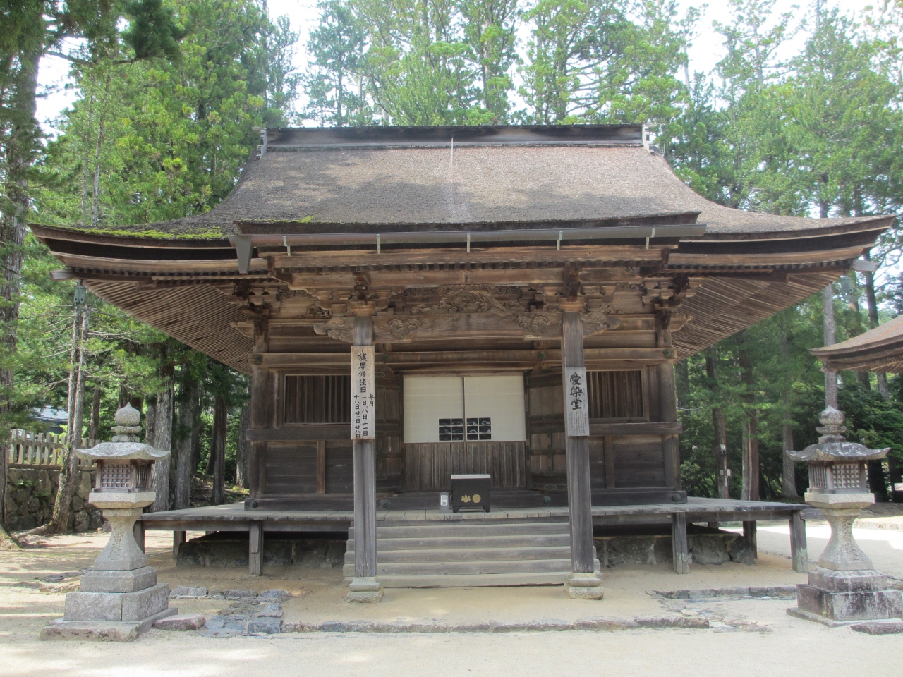 根本大塔のそばの石段を下がった所にあるお堂です。本尊は後醍醐天皇等身の愛染明王で恋愛を司る仏です。他のお堂と異なる波模様の彫り物があるお堂は1848年のものです。根本大塔と東塔は色鮮やかで、金堂をはじめとする他のお堂と西塔はもともと色はついてない木の風情がある建物です。毎月1と8のつく日に護摩修法が行われます。檀上に建てられなかった由来は分かりませんでした。