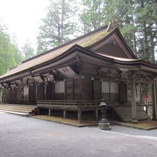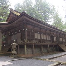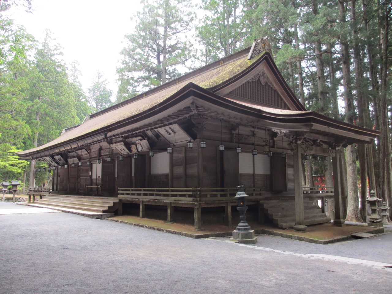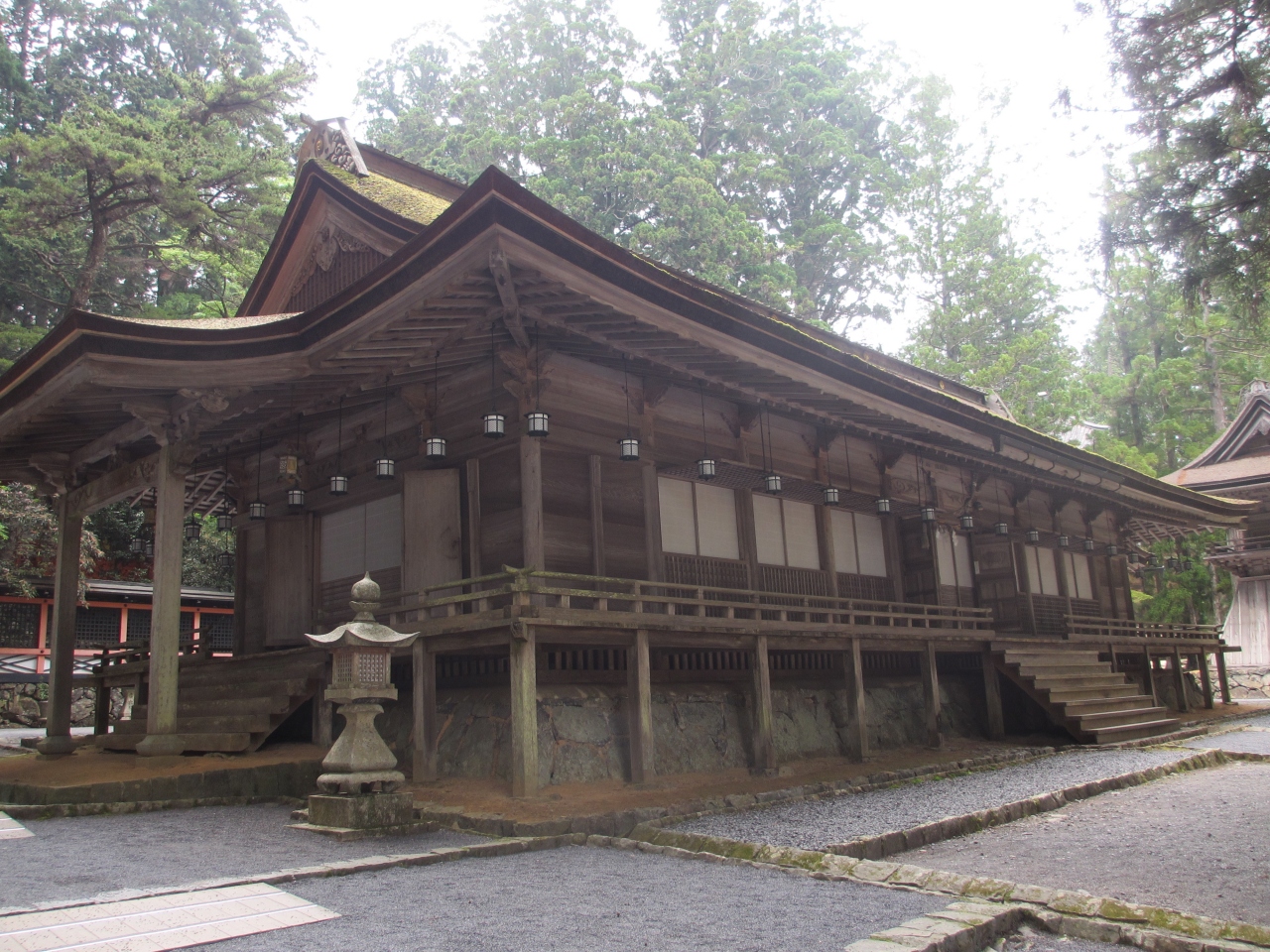 金堂の奥にある御社に祀られている丹生明神と高野明神を礼拝する建物です。壇上伽藍の建物の中でも創建されたのは古く、現在の建物は1845年に再建されました。毎月16日に祈祷が行われます。高野明神は狩りの神で天気が良いと狩りに出かけ、雨が降ると狩りに出かけずいるとされています。実際、祈祷する一時は雨が降る確率が高く7割は雨が降っているそうです。これも高野山の不思議の一つだと思います。御社側に歌人の額が奉納され飾られています。