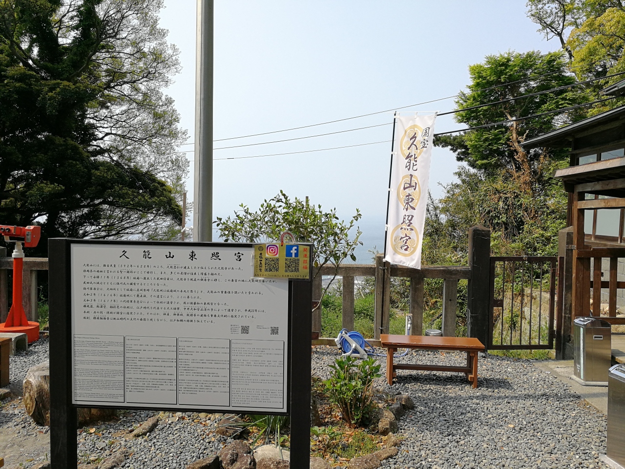 ロープウェイから降りた後、近くに歴史的な場所の板で久能山東照宮の歴史を簡単に紹介される。遠くの景色を見るために拡大機能が用意されています。公共の場所は少しきれいではない。入り口に黄金と赤い建物の建築も見えます。