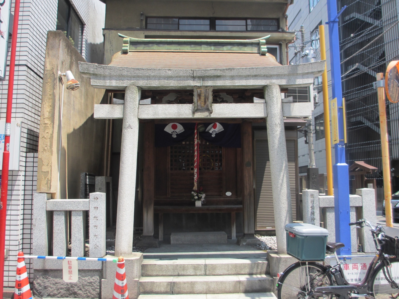 神田駅の西側にある西口商店街にあります。江戸時代この一帯に佐竹藩の江戸屋敷があり鬼門除けとして創建されました。その後幾度の火災で焼失し区画整理で現在地に移りました。正面から見ると社殿が民家に組み込まれているような造りです。参拝できるだけの狭い境内ですが、訪れた時には熱心に祈る人がいました。珍しい社紋の由来が説明板に記されています。近くの神田出世不動尊と共に寄ってみてはいかがでしょうか。