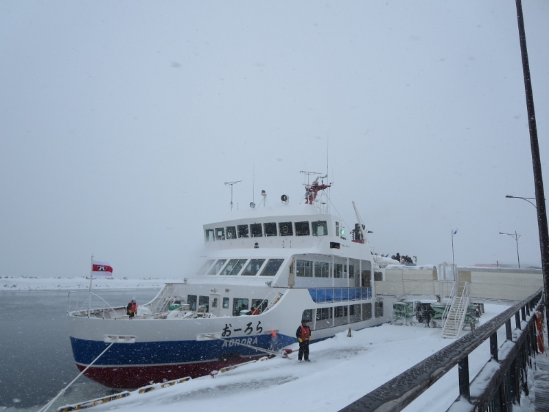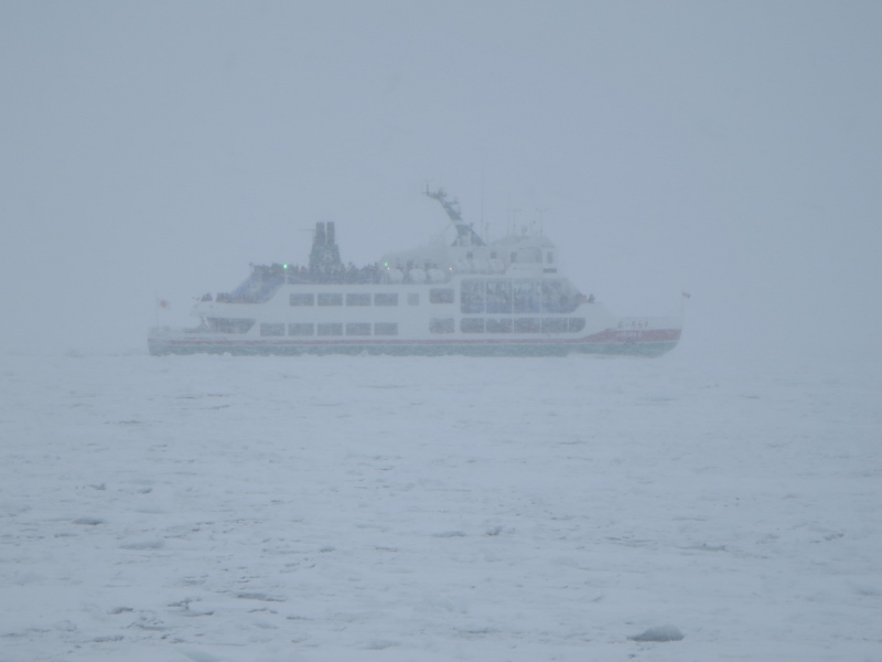 日曜日だったのでとても混んでいました。流氷がたくさん押し寄せてきている時期だったので、寒くてもデッキに出て船の進む方向を見ていました。港を出るとすぐ大雪原のようなものが見えました。流氷の上に雪が積もっていたのです。船がその大雪原を割って進む様子は爽快でした。