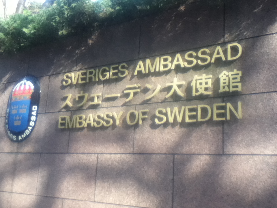 六本木一丁目駅の東側、泉屋博古館分館の向かいにある。前の道路は木々が並び緑豊富である。入口付近は鮮やかな赤い門があり大変目立つ。敷地はまぁまぁ広く、道路側の外壁は円形をしており素敵なデザインである。お勧めの点は、入口付近の門や建物はスウェーデンらしい形状や色合いで素敵なデザインであること、大使館ではシェンゲンビザの申請や留学生の居住許可の郵送申請ができるのでスウェーデン等の旅行準備に便利であること、大使館では一般の人が参加できるクリスマス等イベントも開催していること、周辺の泉屋博古館分館や泉ガーデンと併せて訪問するのもいいかもしれないこと、駅から徒歩で行けることである。
