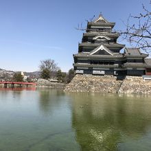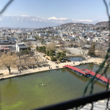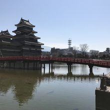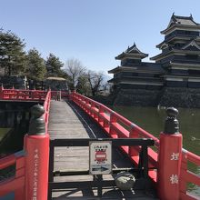 橋の朱色は、天守閣の黒と白の壁・堀の緑・空の青さ・北アルプスの風景との色合いが見事に溶け込み、コントラストを引き立てている。
