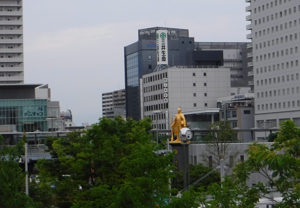 岐阜駅前からバスに乗ろうと駅から歩行者用デッキを歩いている時に、何気に見た方向に金色に輝く信長公らしき像が見えました。デッキからは木々に隠れて全体像は見えないものの、視線の高さからかなり高い位置に立像が設置してあるのが分かります。派手で新しいものが好きそうな信長公に相応しい黄金像です。日本中で黄金色の武将は信長公だけでしょうね。