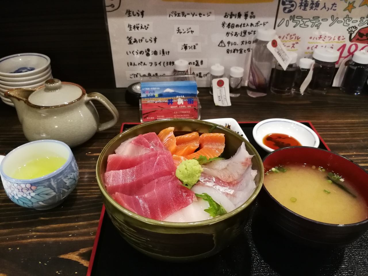 河岸の市まぐろ館へ行って、ぜひ新鮮な海鮮丼の物を食べてみた。やっと1200円のお任せに注文して、5種の海鮮を食べられて、量もたくさんがあります。水準以上だと思います。お茶はティーポットで利用できで、便利です。