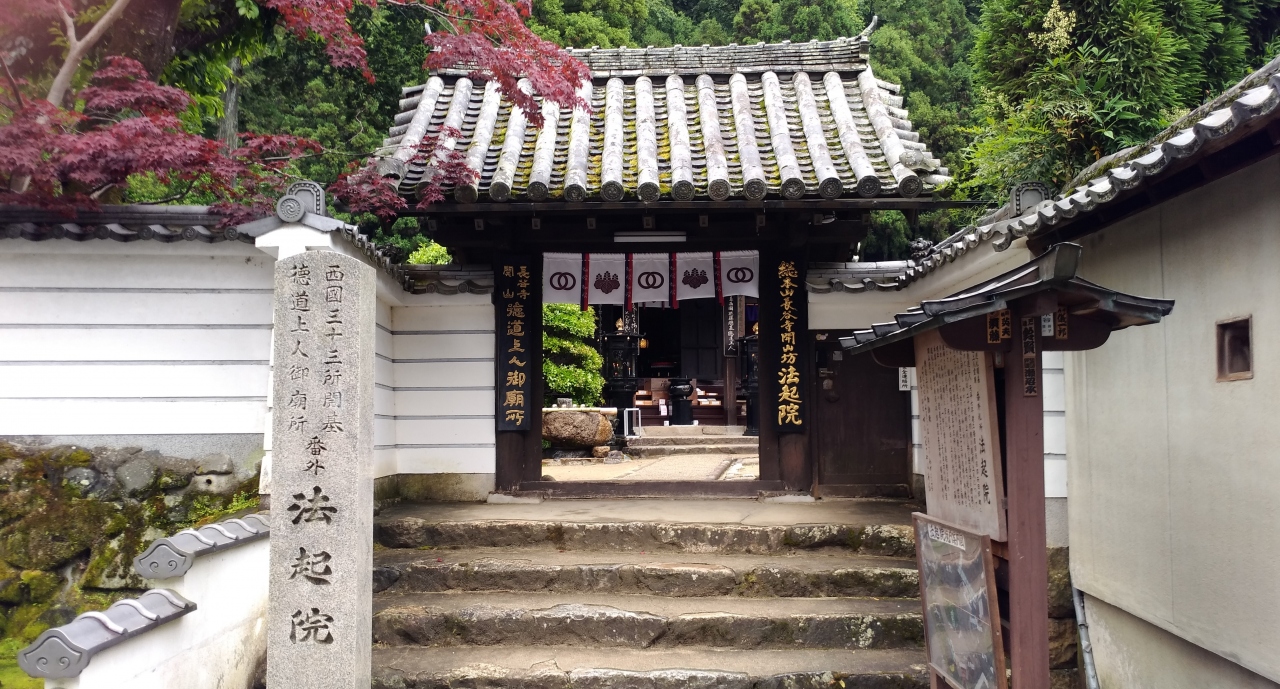 初瀬の門前町を緩やかに上って行った右側やや奥まった所に長谷寺開山坊法起院が在る。長谷寺の塔頭寺院で、長谷寺の本尊十一面観音を造立し、西国三十三観音霊場を開いたとされる徳道上人が晩年隠棲したところである。小さな境内は、じっくり観てもさして時間を要しない。長谷寺と併せて参拝して欲しい寺院である。