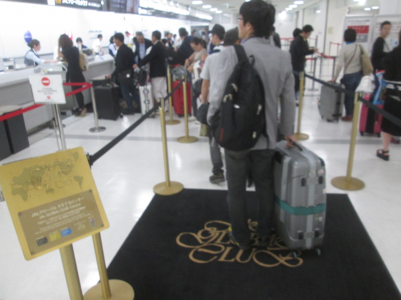 成田空港第2ターミナルの国内線用の搭乗チェックインカウンターは1階にあります。チェックインカウンターには、グローバルクラブ専用のデスクがあります。黒地のカーペットに金色のJGCロゴが高級感を感じます。そして、自分がお客であることを再認識させてくれる対応をしてくれます。