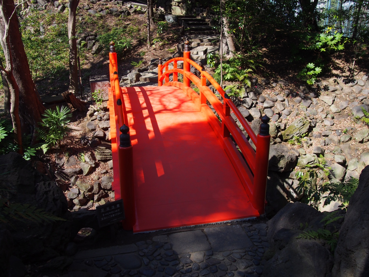 小石川後楽園内の北西にある朱色に塗られた橋です。京都の東福寺の通天橋を模したものだとそうですが、庭園内には見られない色の朱色(赤)はとてもよく目立ちます。まわりの木々の葉などの緑の中で特別引き立つ色です。橋は歩いて渡れます。色のコントラストもあり、良い撮影ポイントで多くの人が撮影をしています。