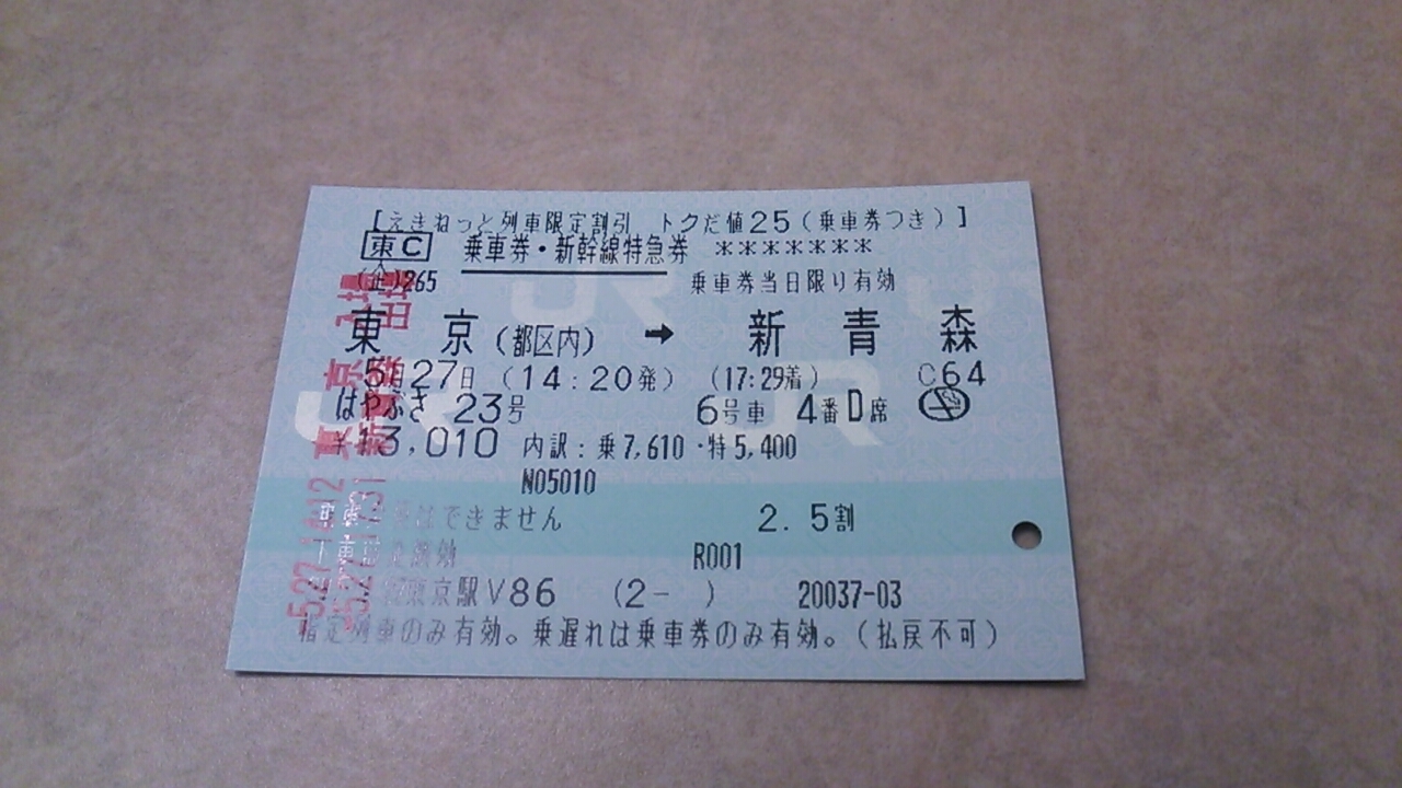 2017年5月27日の土曜日に東京14時20分発はやぶさ23号新函館北斗行きで東京から新青森まで利用しましたが、その際「えきねっとお先にトクだ値」という割引切符を利用しました。