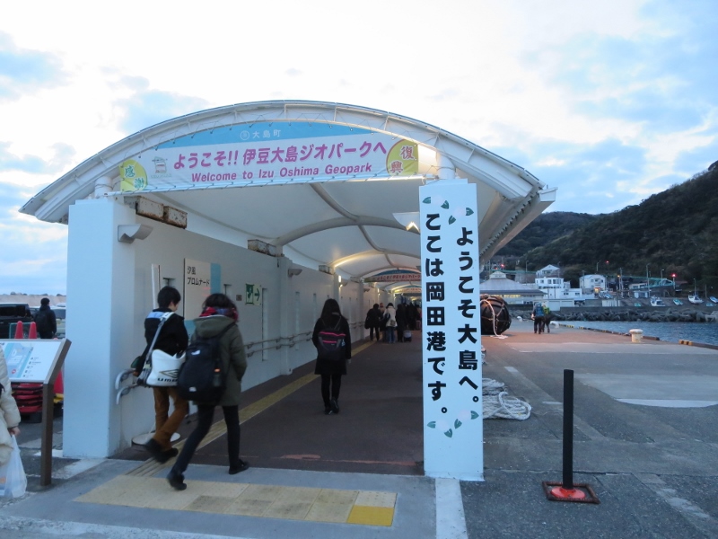 岡田港より元町港の方が開けていますが、冬場は岡田港での船の利用が多くなるとのことでした。待合所の2階は椅子席の他、畳敷きの部屋があるので、船やバスを待つ間ゆっくり過ごすことができます。待合所の1階には土産物屋や食堂もあるので便利です。船の発着時刻が近づくと、乗場まで続くアーケードが活気が出てきます。