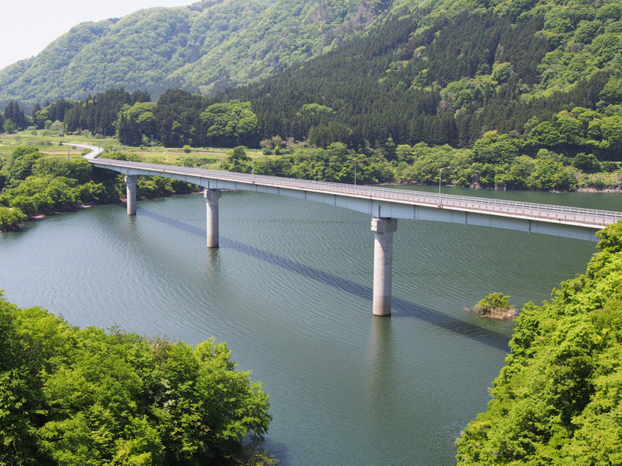 緑豊かでのどかな風景とダムの水面のコントラストがとても美しく、まさに日本の田舎の風景です。