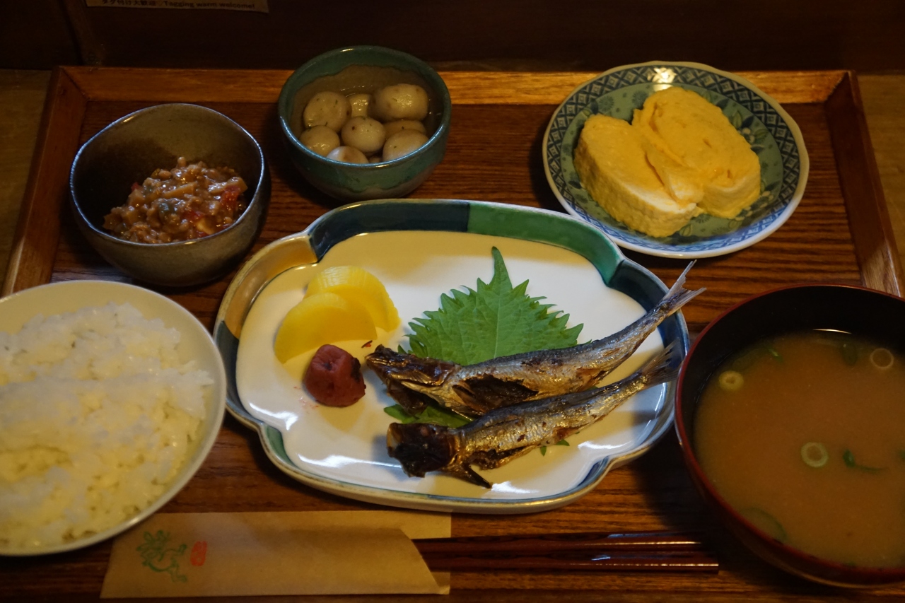 さて、ご飯の方は、そぼろをかけた豆腐、芋の煮たのに出汁卵焼きにメインはメザシ。若いのにそれぞれしっかりおいしく仕上がってますね。ちなみに、私が食べている間にもお客さんが次々やってきては、もう満席ですと断られていました。是非、予約をお勧めします。