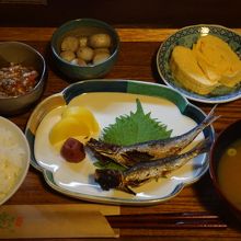 おばんざいの朝ごはんをいただこうと訪ねました。意外に若い女性が切り盛りしていてちょっとびっくり。朝は朝定食だけですと念押しされましたが、いや、それを食べに来たんですよね。