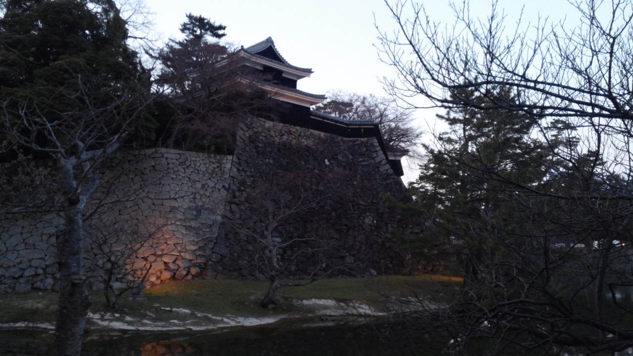 午後6時ごろ行って、外だけで観光しました。その時に点灯を開始するが、もっと夜なら景色によくなると言われる。人がその時に離れる始めました。石垣の形は少しきちんと構造され過ぎると思います。下から黒壁の古城の半分を見えます。