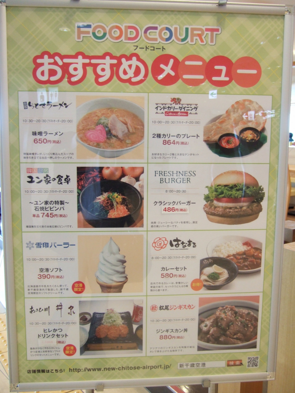 新千歳空港3階にあるフードコート。空港内のお店にしては値段も手ごろで、ラーメンからうどん、カレー、とんかつと色々そろっています。飛行機も良く見えるので、搭乗前に腹ごしらえをしながらビールを飲むのが楽しいです。テイクアウトもいろいろとあります。