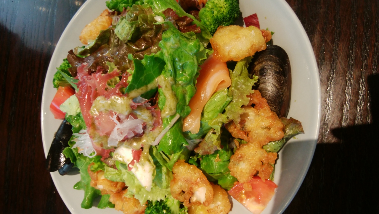 まえは土日に訪れたのですが、平日でも、しかもお昼時を外して16時ごろいったのですが、そこそこ満席でした。カウンター以外は20-30分程度待ちました。今回は魚介のサラダのランチセット。ミネストローネのスープとサーモンやムール貝、フリットしたエビやたこののったサラダ。それと食べ放題のパンです。パンはお願いすると2種類ぐらいもってきてくれます。サラダもボリュームたっぷりでした。