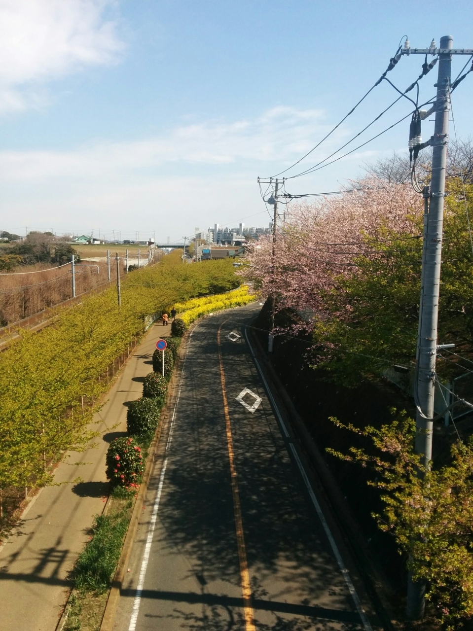 京浜急行「三浦海岸駅」を下車して、徒歩約10分ほど歩くと、三浦海岸駅から小松ヶ池公園にかけて線路沿いに菜の花と河津桜が咲いています。なんともほっこりする風景です。また、時折走る京急の赤ラインともよく合います。