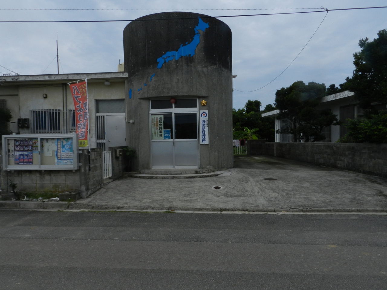 日本最南端の有人島波照間島にある駐在所。名石集落内波照間小中学校の直ぐ傍にあります。島民490人の駐在所で、島には道路信号がなく普通であれば事件も無さそうですが、今は観光客が約35,000人訪れる観光地でシーズンはいろいろ大変だと思います。最北から最南までの青色の日本地図が看板の駐在所が印象に残ります。