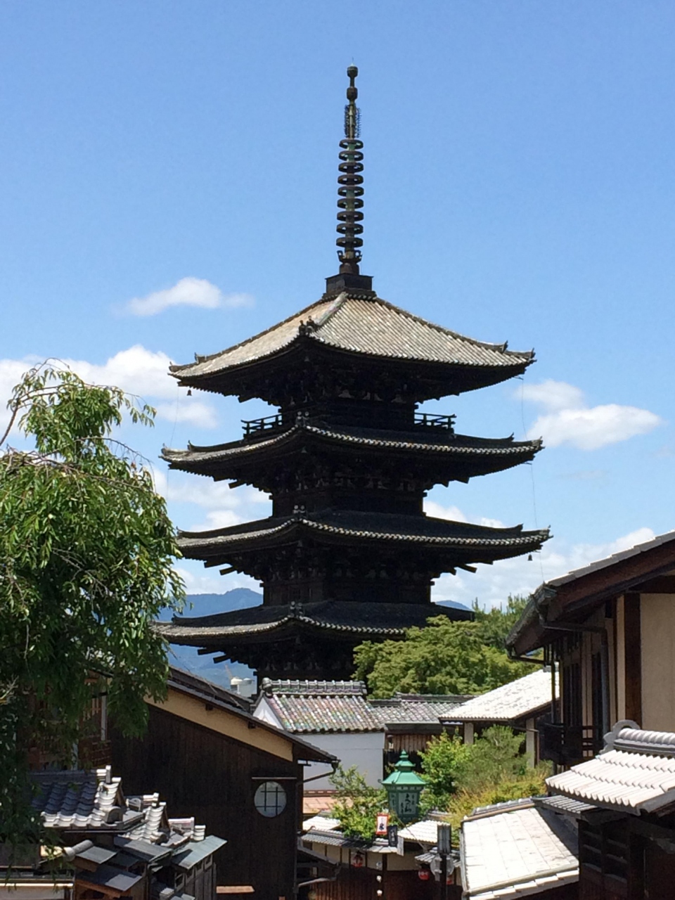料亭や寺社などが立ち並ぶ八坂通を歩いていると突如現れる法観寺、通称「八坂の塔」。